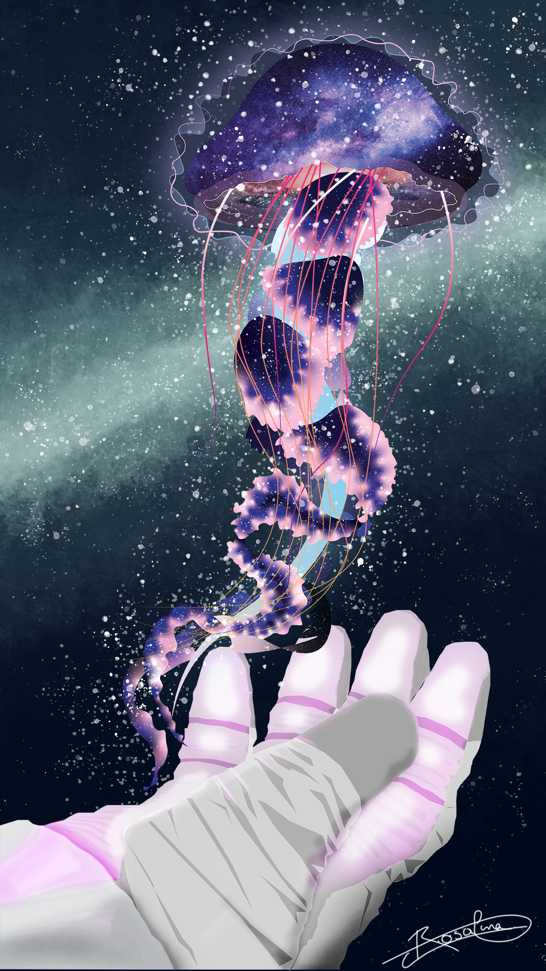J'ai participé au concours du festival national des IUT MMI, où j’ai fini parmi les demi-finalistes, avec cette réalisation. L'Homme ouvre sa main à une nouvelle vie qu'il souhaite protéger car elle symbolise l'espoir. La méduse incarne la grâce, la fragilité et la liberté. Elle est aussi fascinante qu'effrayante car elle vie dans les vastes et mystérieux Océans. La galaxie représente l’infinie et l'inconnue. Je souhaitais à travers ce dessin, exprimer mon respect envers la protection des êtres vivants et aussi mon admiration face aux mystères cachés de la galaxie.